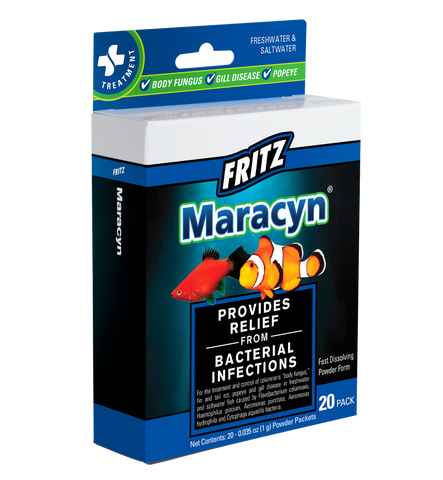 Maracyn® Two powder is a broad-spectrum antibiotic developed for use in aquariums which has been shown to be effective against a number of pathogenic bacteria associated with ornamental fish disease. Due to its unique properties, it is absorbed by the fish through the skin. During the prescribed treatment, the concentration of the active ingredient in the fish fluids rises to a therapeutic level and is available to fight systemic infections susceptible to its action. Maracyn® Two is primarily effective against gram-negative pathogenic organisms. Internal diseases are more difficult to detect than external ones as early detection is almost impossible. It is also potentially effective against some gram-positive and fungal infections, making it our most broad-spectrum treatment, and a great first choice of medication when the cause of disease is unknown.