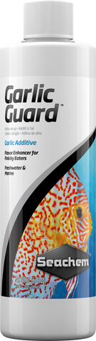 GarlicGuard™ is an all natural garlic scented odor and flavor enhancer for freshwater and saltwater fish. Our research has shown that many fish are attracted to natural odors, such as garlic. Simply mix GarlicGuard™ with any food item, such as Seachem’s NutriDiet® Flakes, to attract the interest of finicky eaters, e.g. discus and marine angelfish. GarlicGuard is safe for reef and planted aquariums.