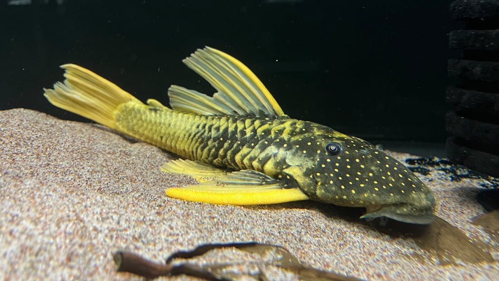 The Hypostomus luteus is a fresh water pleco out of South America. The Luteus hatches with a near black body coloration and white spots, this is considered phase 1. As the Luteus grows and gets larger its fins begin to transition to a yellowish gold coloration. Fully yellow fins with a black body is considered a phase 2. Then the body coloration begins to transition to the yellowish gold coloration, an all gold individual is considered to be phase 3. With their striking coloration and large size they are considered the "Holy Grail" of plecos. Luteus Plecos come from two countries, Brazil and Argentina. The Luteus plecos that are imported from Argentina have a sailfin, much larger than the Luteus plecos from Brazil. This individual Luteus is from Argentina |