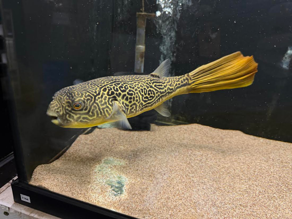 The Mbu Puffer (Tetraodon mbu) is the largest Freshwater puffer fish, known for its unique appearance and interesting behavior. They have a round yellow body covered in a brown pattern with a strong jaw filled with sharp teeth. They can change color depending on their mood and surroundings, ranging from a light brown to a dark greenish-brown. These fish prefer a tank with large swimming areas. They are relatively aggressive and can be territorial with other puffers.